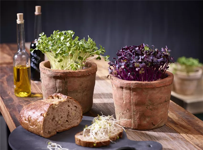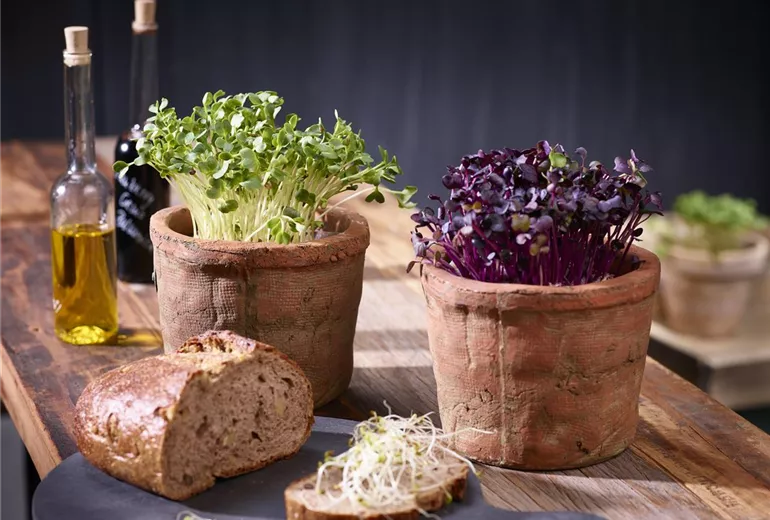 Grünsprossen, auch Microgreens genannt, sind momentan der Trend in Sachen Superfood! Kein Wunder, sie bringen viel Geschmack und Vitamine auf den Teller. Im Gegensatz zu Keimsprossen, die komplett gegessen werden, werden die Mini-Keimlinge über den Wurzeln abgeschnitten. Zudem werden sie in Anzuchterde ausgesät. Saatgut von beispielsweise Radieschen, Senf, Koriander oder Salatrauke wird dafür dicht an dicht in einen mit Anzuchterde gefüllten Blumentopf oder Schale gefüllt. Das Saatgut vorsichtig andrücken und regelmäßig mit Wasser ansprühen. Für ein gleichmäßiges Klima wird Frischhaltefolie über das Gefäß gespannt, damit sich kein Schimmel bildet muss diese einmal am Tag entfernt werden. Schalen können auch mit feuchtem Zeitungspapier abgedeckt werden, sobald die Keimlinge das Papier hochdrücken, wird es abgenommen. An einem hellen und warmen Standort ohne direkte Sonneneinstrahlung kann anhängig von der Keimzeit der Sorte schon nach gut einer Woche mit der Ernte der herrlich würzig schmeckenden Grünsprossen begonnen werden.