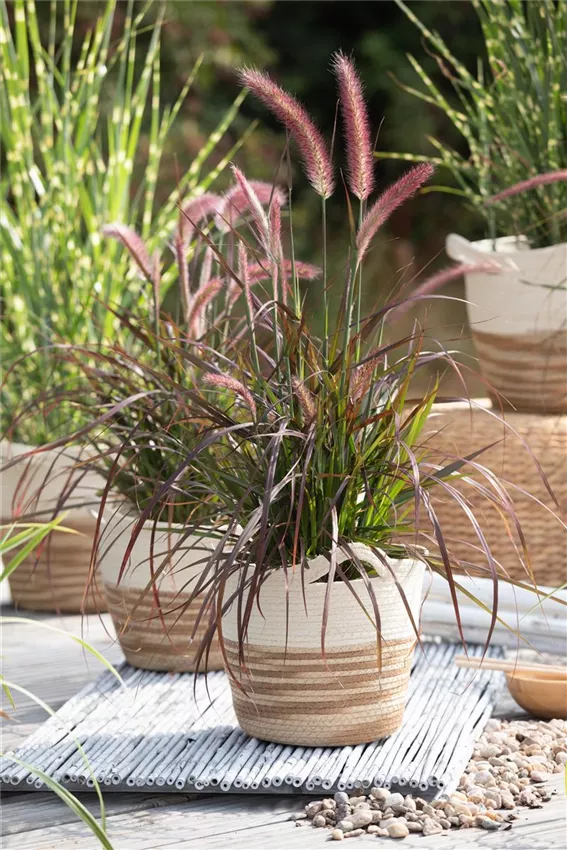 Gräser sind Flachwurzler und eignen sich daher auch gut für die Bepflanzung von Kübeln auf Balkonen und Terrassen. Dabei ist ein guter Wasserabzug durch eine Drainageschicht aus Blähton oder Kies sehr wichtig! Attraktive Gräser für kleine Töpfe sind zum Beispiel Blauschwingel, Segge, Zittergras oder Plattährengras. Lampenputzergräser können wunderbar mit Besenheide oder anderen klassischen Herbstpflanzen wie Chrysanthemen in einem Pflanzgefäß kombiniert werden, mit den rot leuchtenden Halmen des japanischen Blutgras können tolle Farbakzente gesetzt werden. Chinaschilf, Federgras, Pampasgras oder Rutenhirse kommen als Solitärgras besonders schön zur Geltung und werden daher am besten in große Kübel gesetzt.