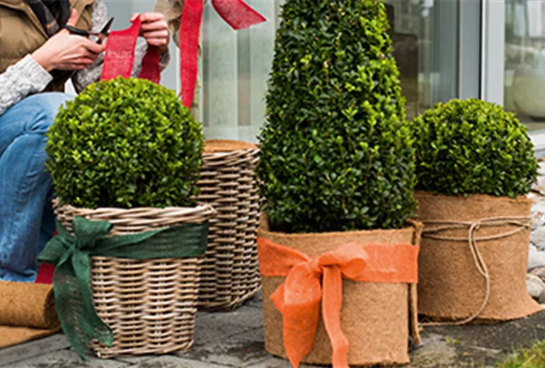 Besonders bei immergrünen Gehölzen wie Buchsbaum, Liguster, Ilex, Kirschlorbeer oder Bambus ist ein Winterschutz für die Kronen notwendig. Diese Pflanzen verdunsten trotz Winterruhe ständig Feuchtigkeit über die Blätter. Ist der Boden gleichzeitig gefrorenen, kann die Pflanze diesen Wasserverlust nicht über die Wurzeln ausgleichen. Dieses Phänomen wird als Frosttrocknis bezeichnet. Ein helles Wintervlies schafft Abhilfe, indem es die Pflanze schattiert, aber trotzdem noch genügend Licht durchlässt. Das Vlies kann mit Jute-Wickelband befestigt und gleichzeitig dekoriert werden.